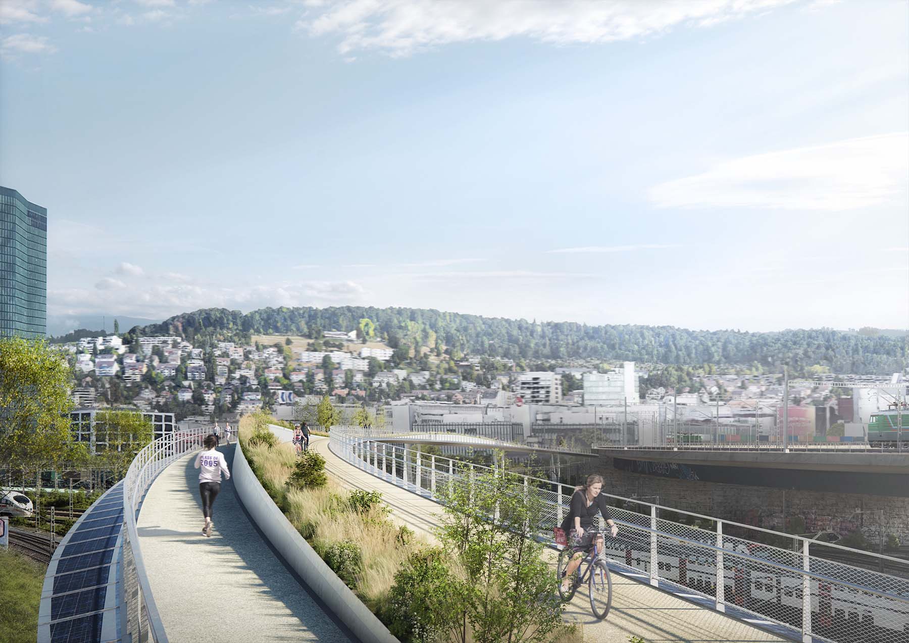 Der begrünte Mittelstreifen der Velobrücke soll für erhöhte Aufenthaltsqualität sorgen. (Visualisierung: Tiefbauamt Stadt Zürich)