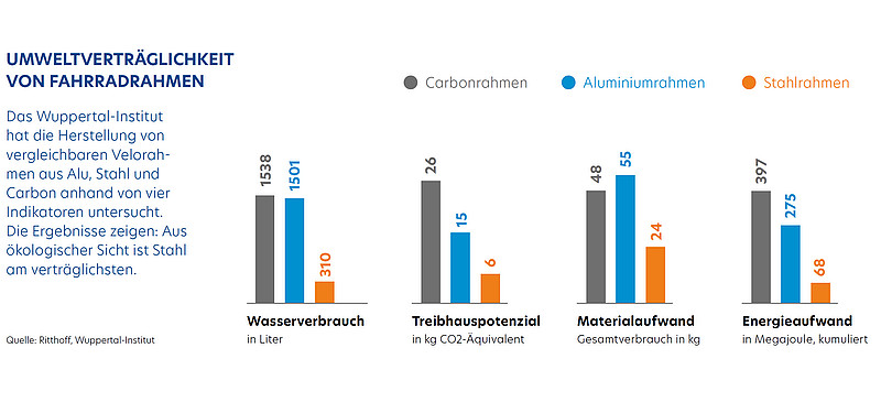 Bei vielen modernen E-Bikes, Mountainbikes und sportiven Velos kommt heute Carbon als Rahmenmaterial zum Einsatz. Sowohl bei der Umweltverträglichkeit (siehe Grafik) als auch bei der Wiederverwertung schneiden Kohlefaser-Verbundstoffe schlechter ab als Stahl und Aluminium.