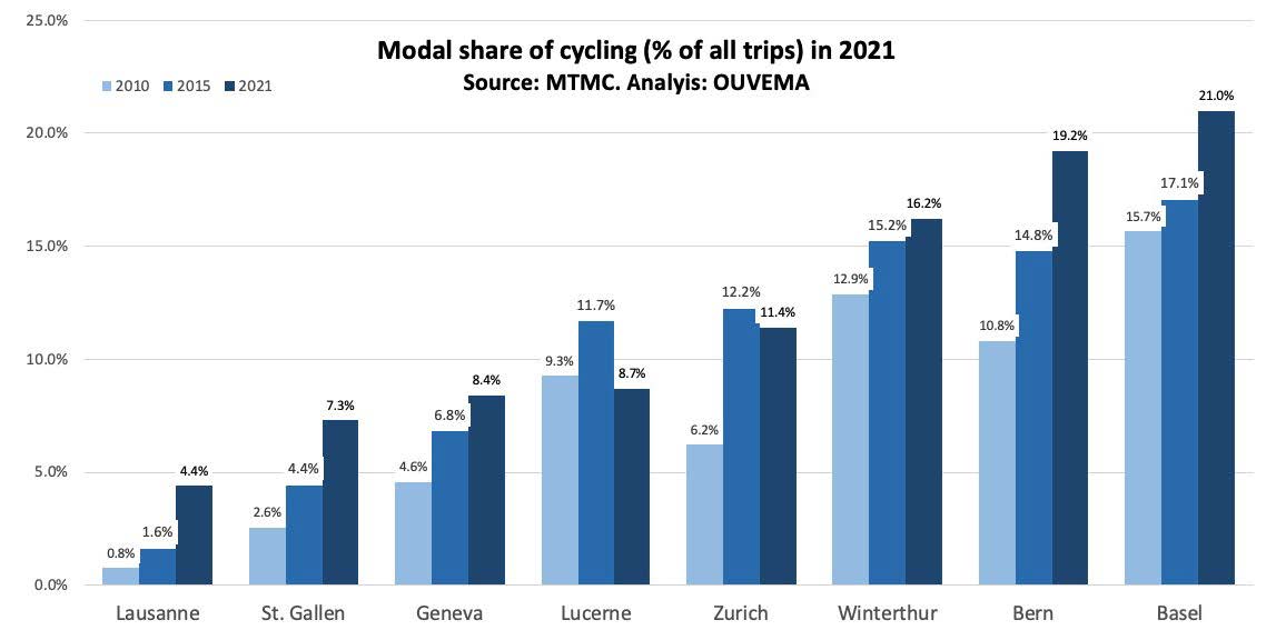 Auch in den Westschweizer Städten Lausanne und Genf sowie in der Ostschweiz holt der Veloverkehr auf. An allen drei Orten hat der Anteil des Fahrradverkehrs am Gesamtverkehr gemäss der Ouvema-Auswertung in den letzten fünf Jahren zugenommen.
