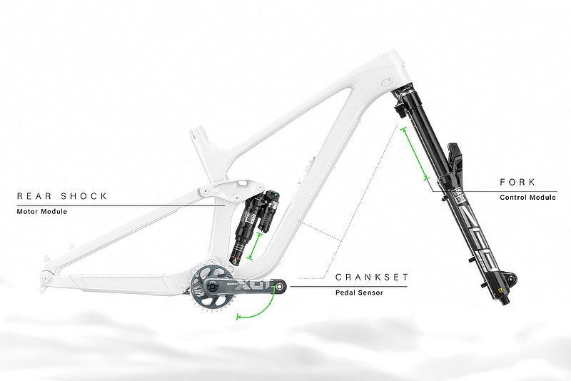 Mit der «Flight Attendant»-Technologie erfolgt die Verbindung von Antrieb und Fahrwerk. Dazu werden Sensoren an der Tretlager-Achse sowie an der Federgabel und dem Federbein angebracht, die permanent Daten sammeln und das Fahrwerk blitzschnell an die jeweilige Situation anpassen – ob Anstieg, welliges Gelände oder verblockte Abfahrt.