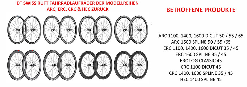 Am 12. Juli hatte DT Swiss bereits dazu aufgerufen, Laufräder der Baureihen «ERC», «CRC» und «HEC» mit Felgenhöhen von 35 mm und 45 mm nicht mehr zu benutzen. Der Grund dafür waren Probleme mit der Delamination, welche die strukturelle Integrität der Felgen infrage stellten.