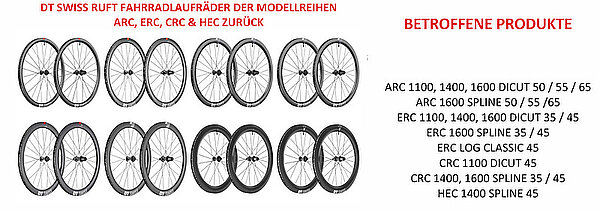 Je nach Ausgang dieser Überprüfung werden die Laufräder ersetzt oder retourniert. Vom Rückruf sind wie zunächst vermeldet die Baureihen «ERC», «CRC» und «HEC» mit Felgenhöhen von 35 mm und 45 mm betroffen und neu auch DT-Swiss-«ARC»-Laufräder mit 50 mm, 55 mm oder 65 mm hoch bauenden Carbonfelgen.