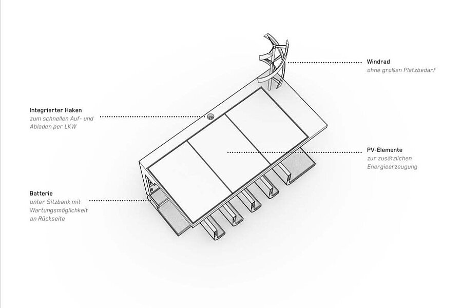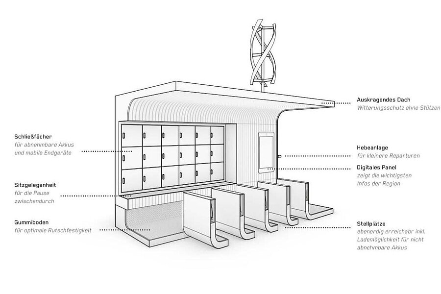 Das Laden eines E-Bike-Akkus oder Smartphones an der Station wird kostenlos möglich sein. Der dafür benötigte Strom stammt aus Solar- und Windenergie. Die Ladestation soll über mehrere Steckdosen und USB-Anschlüsse verfügen. Für die Nutzerinnen und Nutzer stehen dereinst Schliessfächer zur Verfügung, in denen sie ihre Geräte zum Laden sicher verstauen können. Wer sich während des Ladens beschäftigen will, kann den WLAN-Hotspot nutzen.