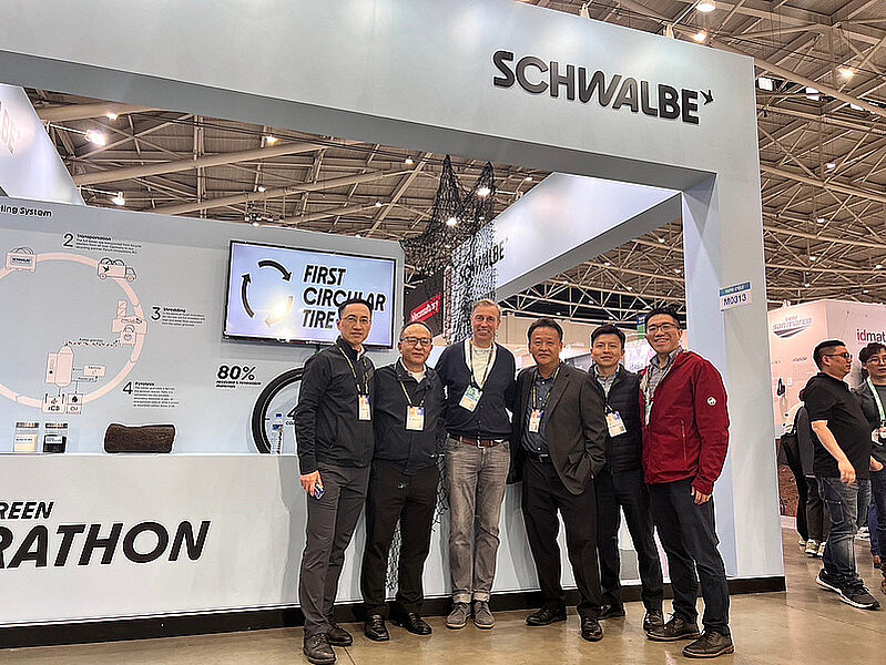 Schwalbes CSR-Manager Felix Jahn (3. von links) mit einer Delegation von Formosa Taffeta am Messestand – darunter Edward Lung (ganz rechts). (Foto: Laurens van Rooijen)