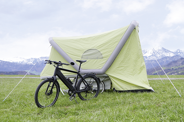 Die Kraft des Elektrovelos erlaubt es Veloreisenden, üppigeres Gepäck mitzunehmen und sich das Campingleben komfortabler zu machen. Warum also sich in ein gewichtsoptimiertes Zeltchen verkriechen, wenn man auch in einem komfortablen Kleinwohnwagen nächtigen kann? Die Idee beflügelt Konstrukteure und Entwickler, sodass immer wieder Entwürfe und Prototypen von Fahrradanhängern auftauchen, die auch als Schlafplätze genutzt werden können. Nun stellt die österreichische Firma Gentletent die Serienversion ihres Fahrrad-Mikro-Wohnwagens vor. Die Firma ist spezialisiert auf Zelte, die sich aufblasen lassen. So ist ihr Schlafmobil, wie die Alpenkreuzer der 60er-Jahre, eine Mischung aus Zelt und Wohnwagen. Anstelle eines Gestänges bilden bei Gentletent voluminöse, aufblasbare Luftschläuche das Gerippe für die Zeltkonstruktion.