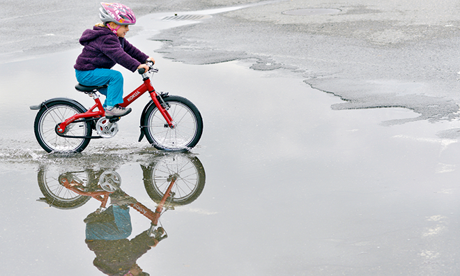 Doch das «Like to Bike» besticht nicht nur durch die schlaue Schaltung: Das Velo gehört mit 8,3 Kilo zu den leichteren auf dem Markt. Der Rahmen in Unisex-Form ist recht tief geschnitten, sodass sich die Kinder nicht im Schritt stossen können. Die Ausrüstung wurde zugunsten des Gewichtes auf ein Minimum reduziert: Ausgeliefert wird das Velo mit Ständer und dem cleveren «Chain Runner»-Kettenschutz. Dieser ist über die Kette gestülpt, dreht mit und ist dadurch leicht und dennoch sehr robust. Hosen und Hände sind bestens vor Verschmutzung geschützt, zudem muss die Kette weniger geölt werden.