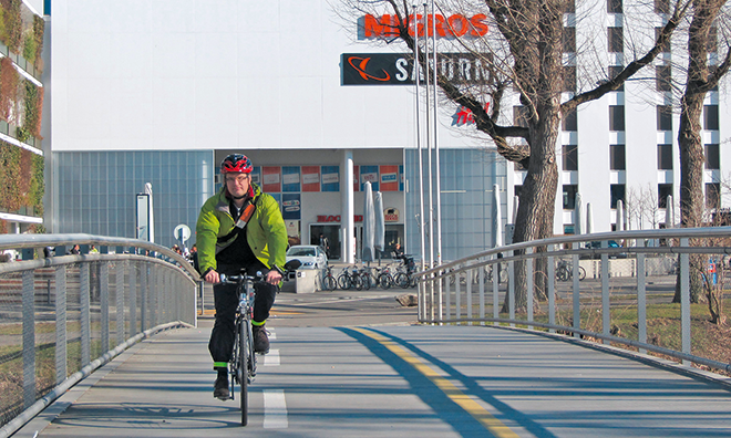 Basel legt Velofahrenden den roten Teppich aus und gewinnt den Hauptpreis. Die Stadt nimmt den Charakter der Zufahrten zu Schlössern, Herrschafts- und Landhäusern auf. Diese führen oft über eine von alten Bäumen gesäumte Strasse. Eine ähnliche Sinneserfahrung machte die Jury, als sie über den Stückisteg das Flüsschen Wiese querte, um zum Einkaufszentrum «Stücki» zu gelangen. Der Steg ist eine 55 Meter lange Fuss- und Radwegbrücke. Rund fünf Meter Breite sind den Velofahrenden reserviert, auf einem vom Fussverkehr getrennten Radweg mit zwei richtungsgetrennten Fahrbahnen. Die Brücke aus Stahl und Beton wurde als flankierende Massnahme beim Bau des Einkaufszentrums erstellt.