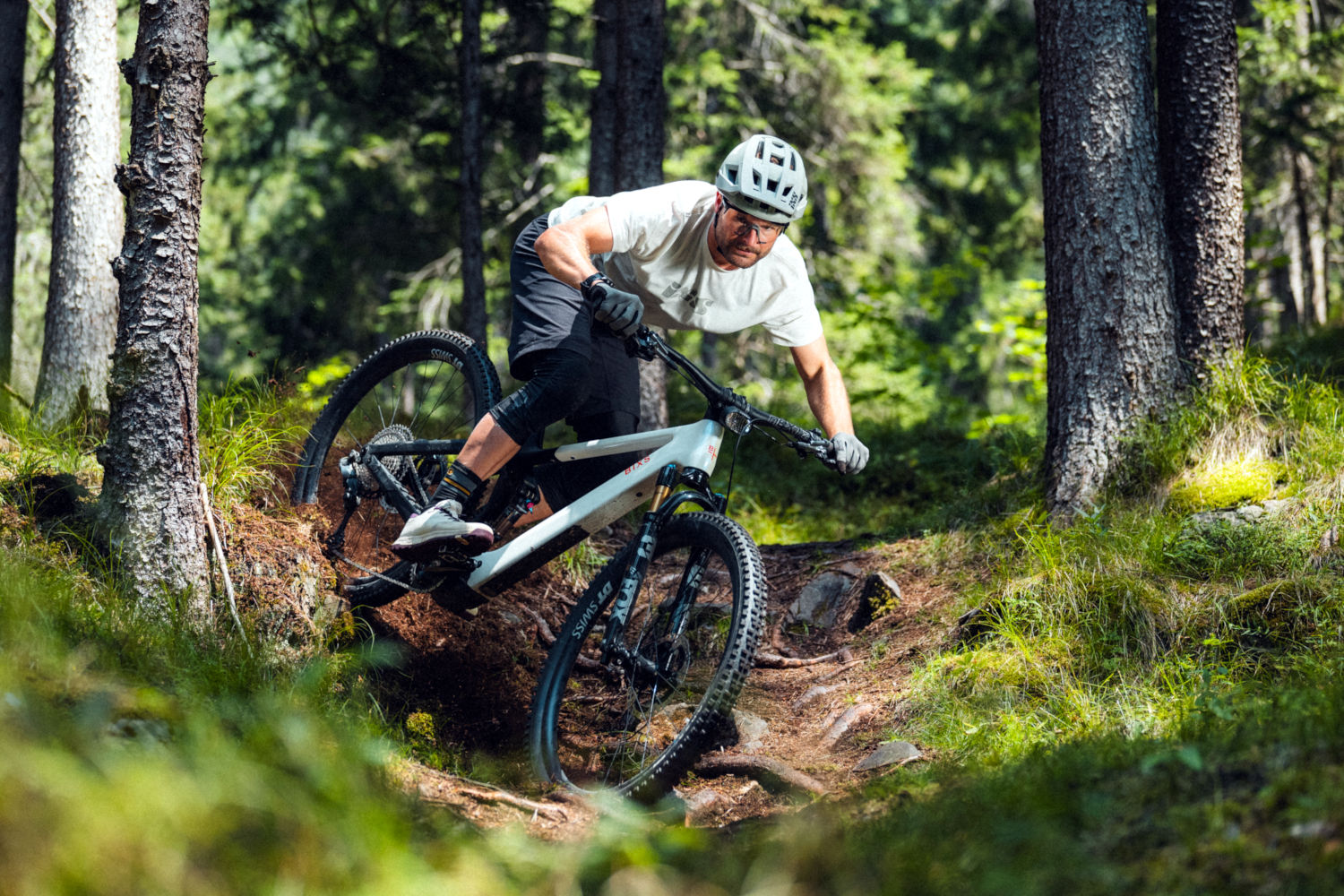 Im Unterrohr des Carbonrahmens steckt ein Akku mit einer Kapazität von 400 Wh. Für lange Touren lässt sich ein externer Zusatzakku mit einer Kapazität von 388 Wh montieren, was die Reichweite fast verdoppelt. Die Federelemente steuert bei allen drei Modellen Fox bei, wobei der Federweg vorne 140 mm und hinten 130 mm beträgt. Zusammen mit den 29-Zoll-Laufrädern sind so einige Reserven für grobe Passagen an Bord.