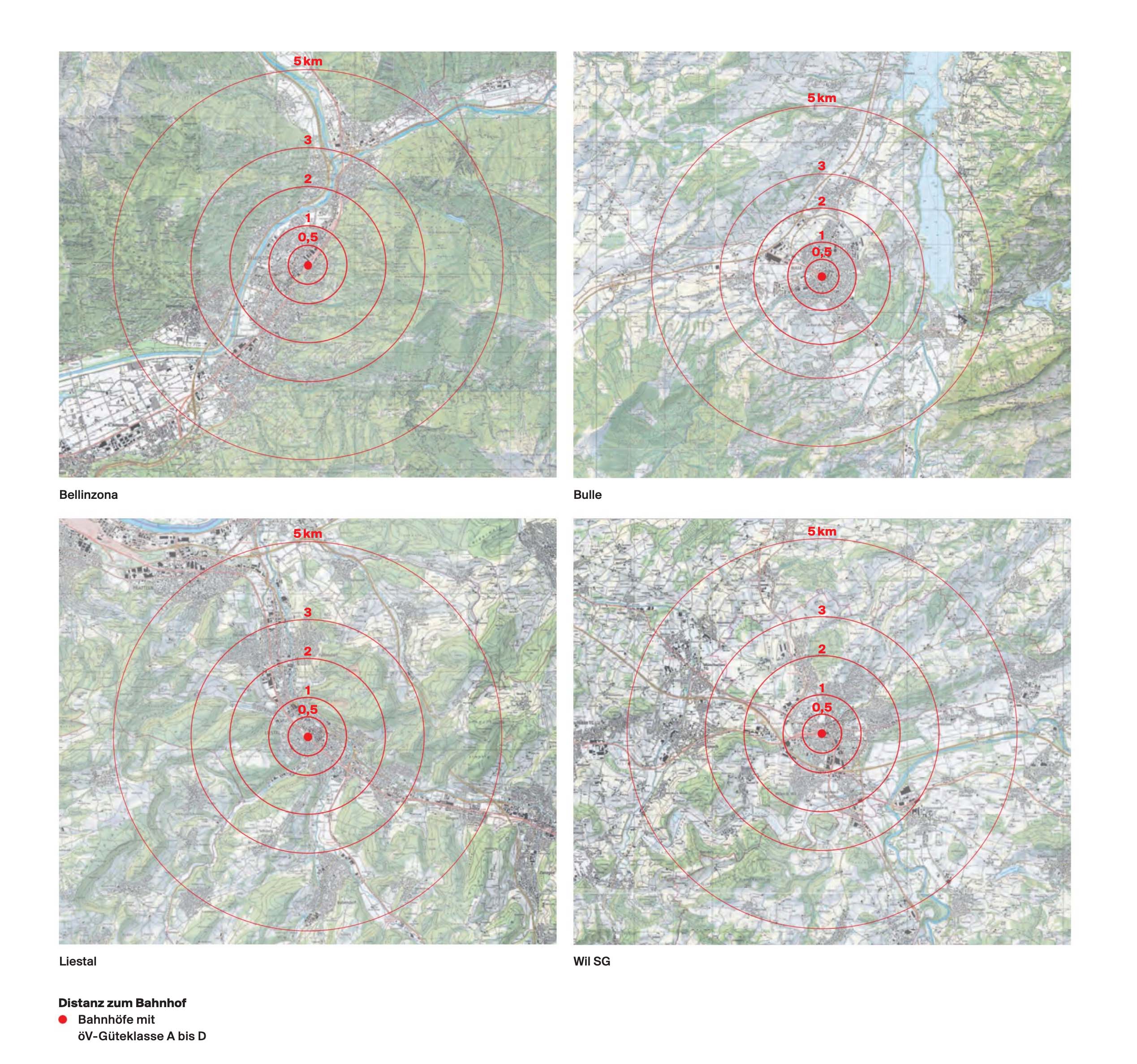 Die Karte der zufällig ausgewählten Orte Bellinzona, Bulle, Liestal und Wil zeigt eindrücklich, was die Entfernung von maximal fünf Kilometern bedeutet: Aus dem gesamten Siedlungsgebiet erreicht man den Bahnhof mit dem Velo – oder in Bergregionen und wenn die Distanz mehr als drei Kilometer beträgt mit dem E-Bike – in rund 15 Minuten.