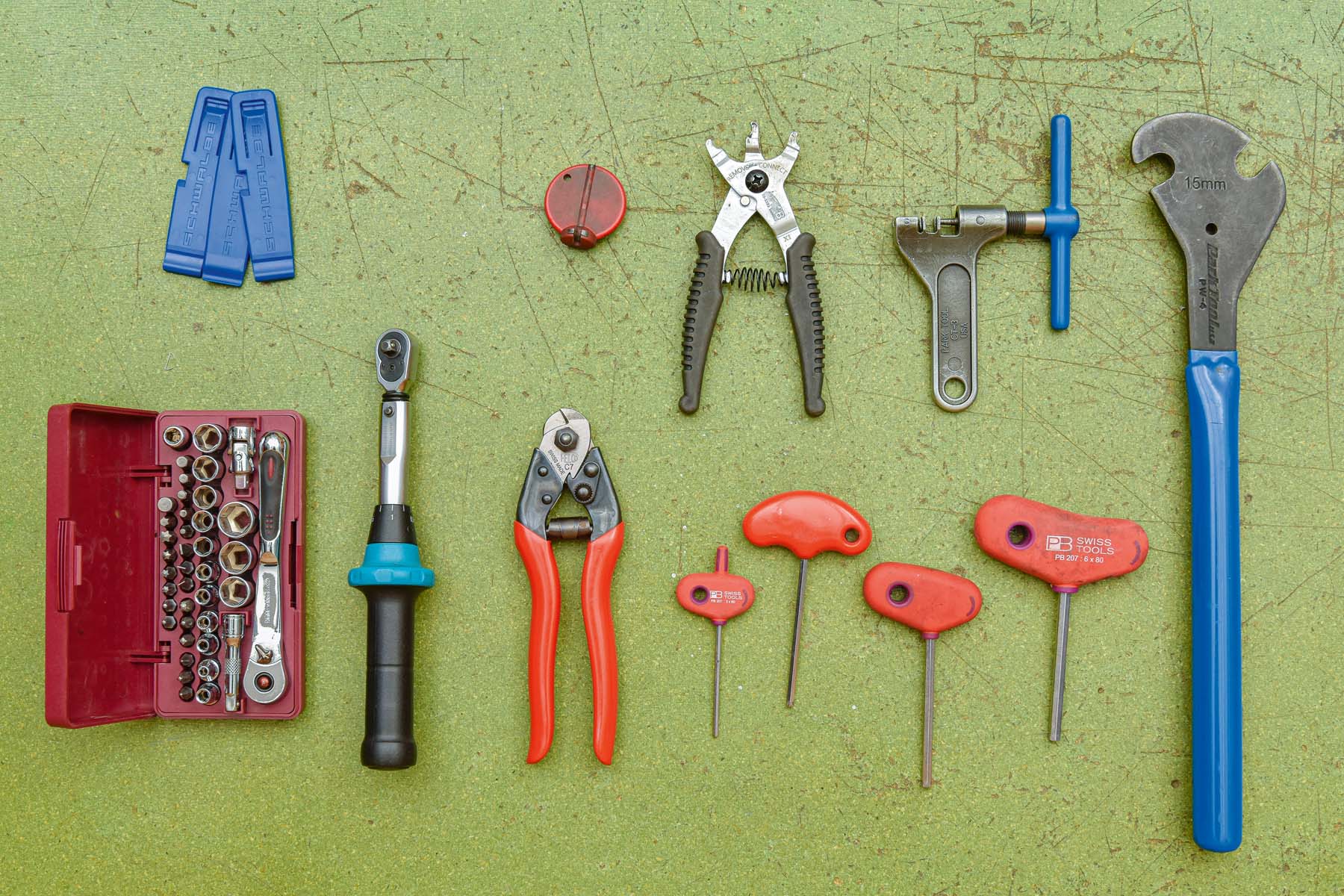 Als Grundwerkzeug braucht die Velowerkstatt: Inbusschlüssel, Torx-Schlüssel, Schraubenzieher, Zangen, Gabelschlüssel. Ganz praktisch sind zudem Feilen und Eisensäge. Als Spezialwerkzeug lohnt sich bald einmal ein Pedalschlüssel. Und dann – je nachdem, ob man sich an die entsprechenden Arbeiten wagt – Werkzeuge für Kassetten, Kette, hydraulische Bremsen, Tretlager und so weiter. Diese sind von verschiedenen Anbietern meist verhältnismässig kostengünstig in Sets erhältlich – mit dem Risiko, dass genau der benötigte Schlüssel dann gleichwohl nicht mit dabei ist. Die Alternative dazu ist, sich die Spezialwerkzeuge einzeln nach Bedarf zu besorgen.