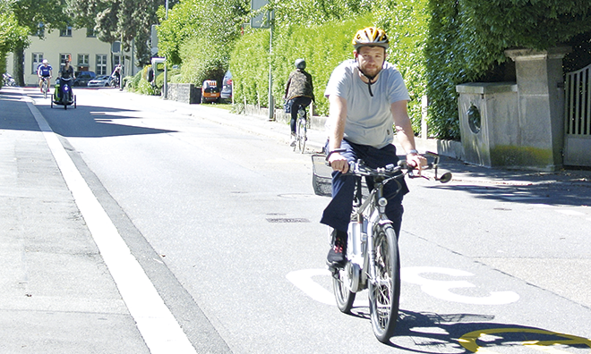 Mehr Velo geht nicht. Das gelbe Signet sagt, wer auf dieser Strasse Vortritt hat.