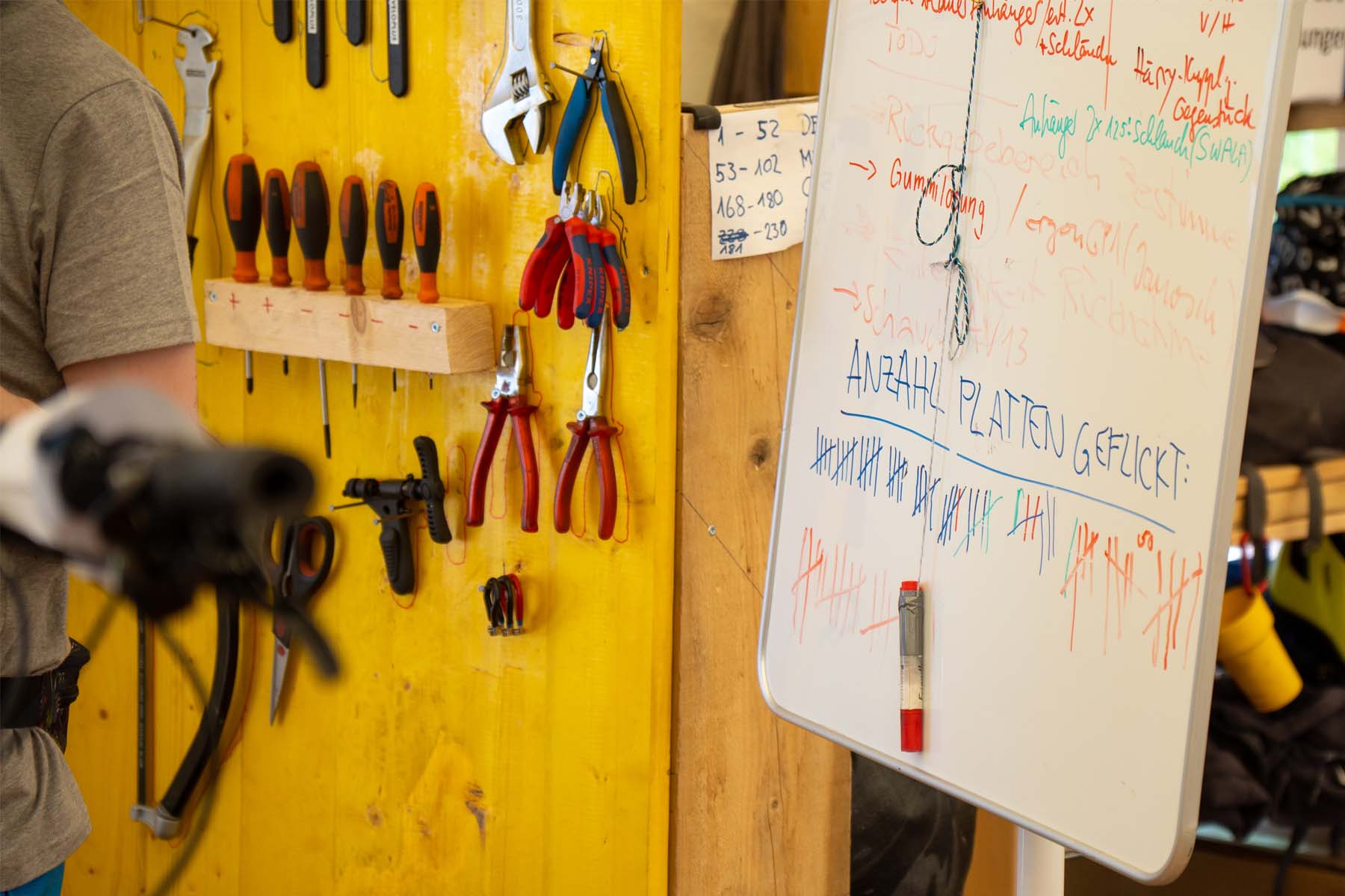 Im Velokompetenzzentrum «Rotadrom» wurde alles rund ums Velo abgewickelt. Die Werkstatt mit den wichtigsten Ersatzteilen hatte kaum eine ruhige Minute, platte Reifen waren an der Tagesordnung.