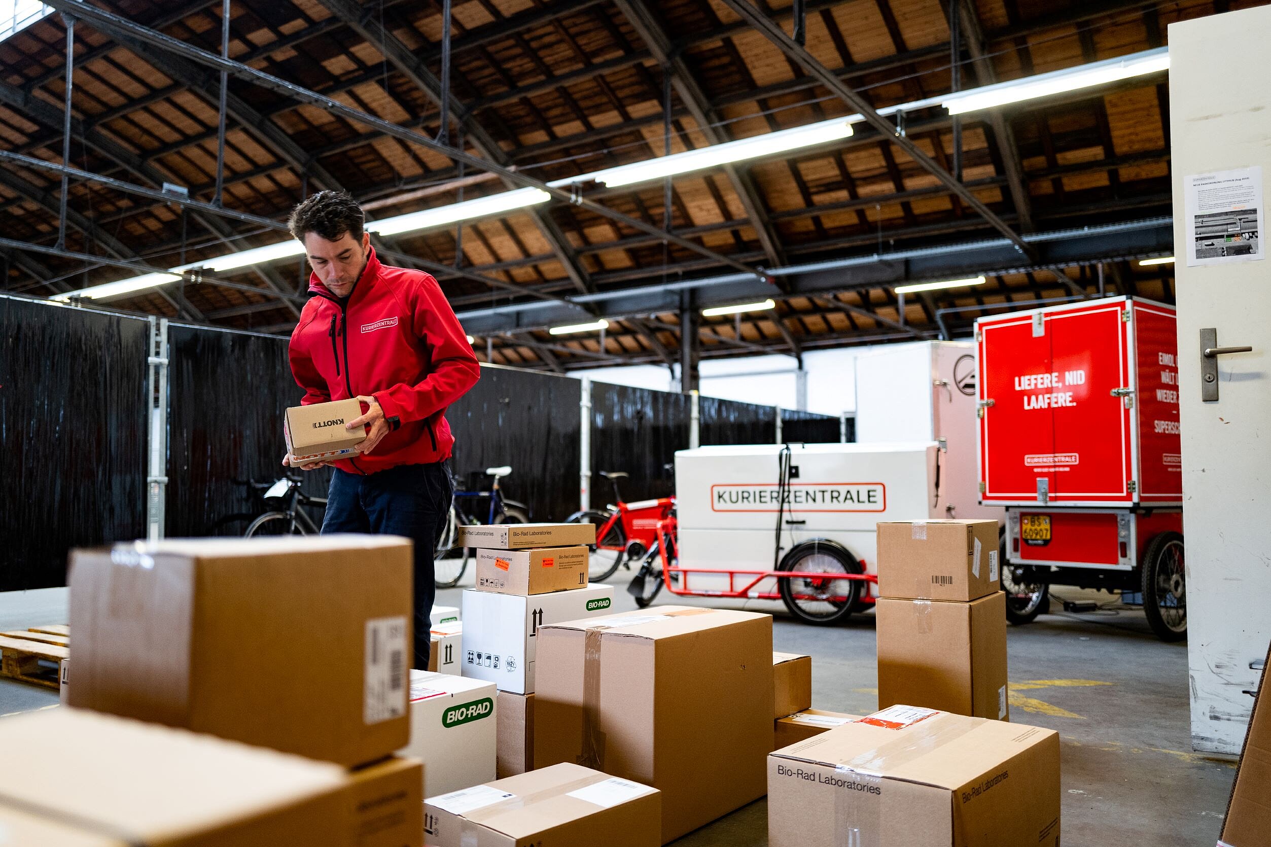 Nicht nur mit lokalen Produzenten, sondern auch mit national und global agierenden Logistikunternehmen arbeitet die Kurierzentrale in Basel zusammen. Auf der Umschlagfläche der Kurierzentrale werden Pakete aus dem Lastwagen auf Cargobikes und Anhänger umgeladen. Diese fahren als Teil des Güterverkehrskonzepts des Kantons Basel-Stadt emissionsarm, leise und platzsparend in die Innenstadt zum Endkunden.