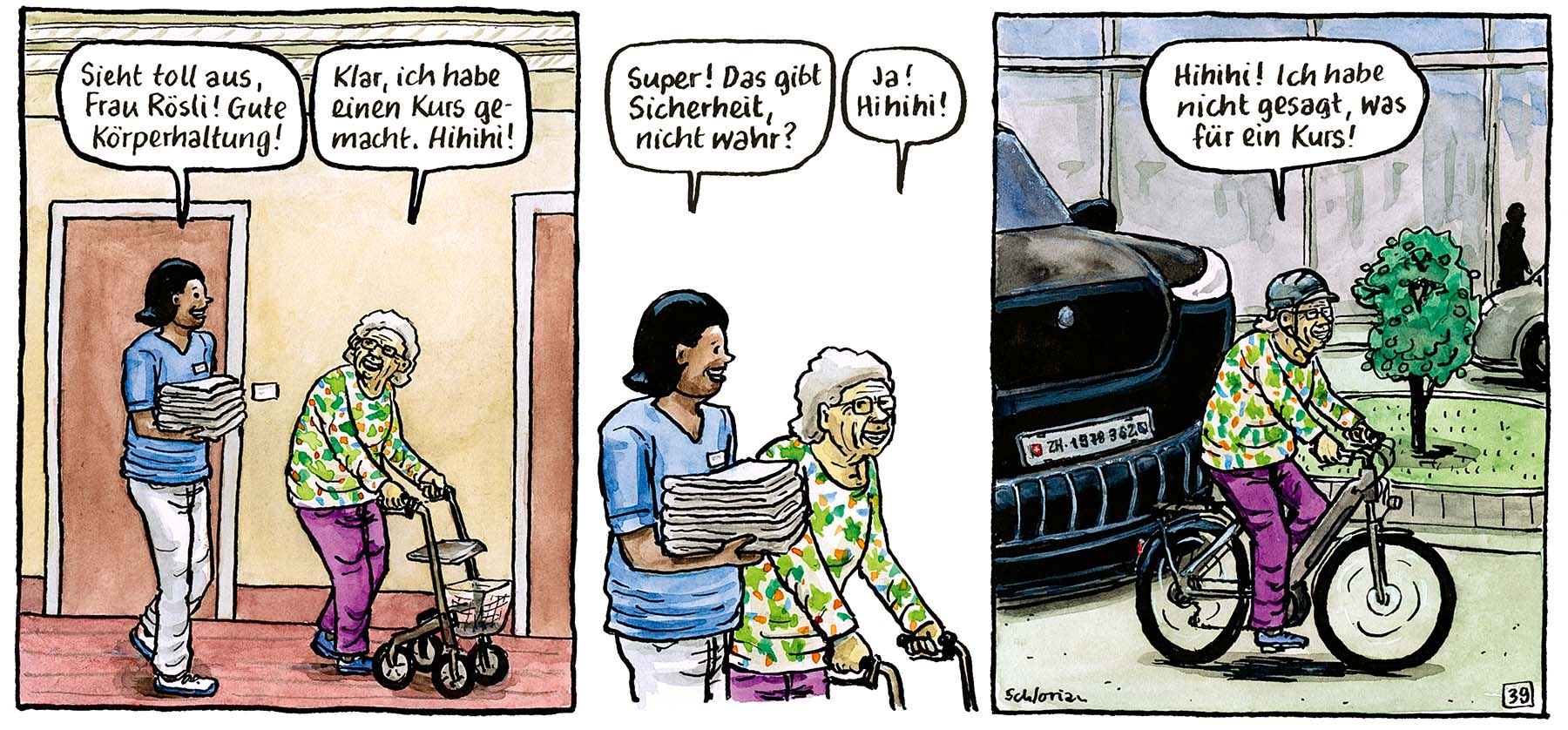 Wie heisst es doch so schön: Velofahren verlernt man nicht. Warum E-Bike-Kurse dennoch eine gute Sache sind – und das in mancherlei Hinsicht – verrät der Comic.