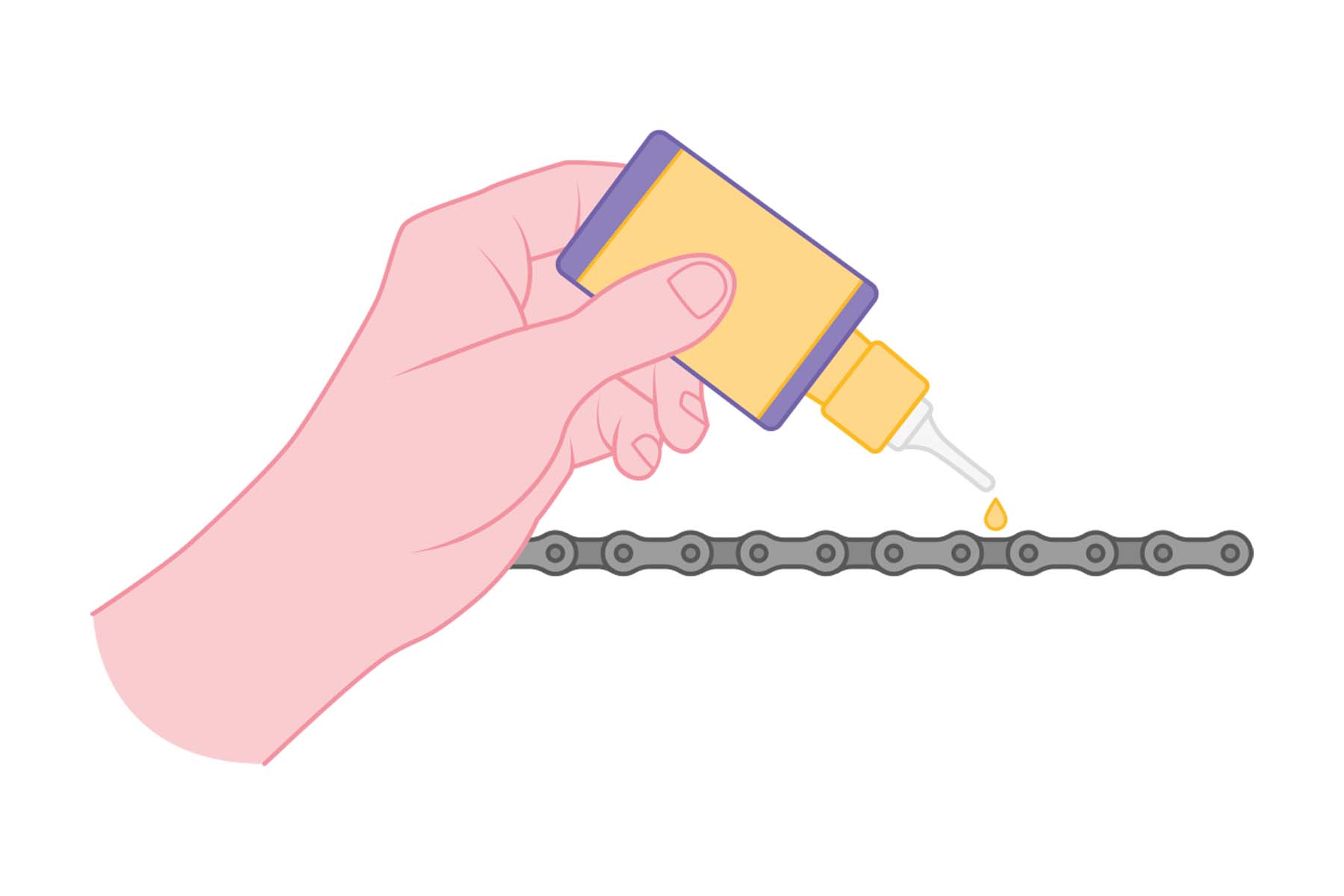Ist die Kette gereinigt, muss auf jedem Kettenglied ein Tropfen Kettenöl platziert werden. Danach kann das Kind wieder an den Pedalen kurbeln, damit sich das Schmiermittel schön verteilt. Öl kurz einziehen lassen (in der Zwischenzeit pumpen). Zum Schluss überschüssiges Öl abwischen.