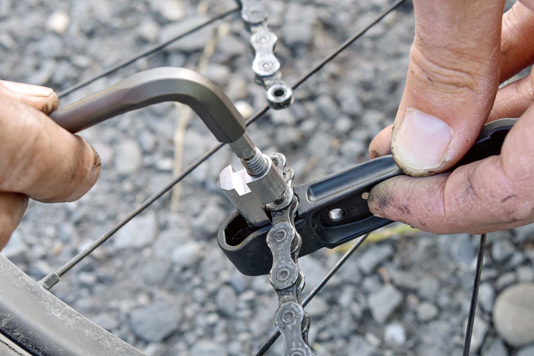 Um die Kette zu reparieren, wird das defekte Kettenglied entfernt. Dafür wird mit dem Kettennietendrücker an der schadhaften Stelle der Bolzen durch die Aussenlaschen gepresst und damit die Kette geöffnet. Zum Arbeiten legt man die Kette am besten vorne und hinten auf den kleinsten Zahnkranz, so ist die Kette weniger unter Spannung.