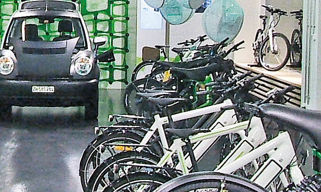 Projekte für trendige E-Bike-Shops, ja sogar ganze Ladenketten, gab es in jüngster Zeit einige. Ob sie alle überleben können, ist noch offen. Anders sieht es aus, wenn der Riese Migros einsteigt, denn der Konzern kann grosszügiger und langfristiger kalkulieren: Gestartet wurde mit einem «Flagshipstore» an bes­ter Lage mitten in Zürichs Bankenviertel. Dort findet man eine extravagante Ladeneinrichtung, wie sie noch in keinem Zweiradgeschäft zu finden war: Das Holz der Verkaufskorpusse stammt aus der Region, und die Designelemente wie Lichtrad, Glasvorhang und «Mood Drops» sind eine Anlehnung an die Wasserkraft. Präsentiert werden die Fahrzeuge mit einem didaktischen Infotainment-Programm: Multimedia-Screens, Lernsäulen und Schubladen mit Exponaten sowie eine spezielle Bibliothek vermitteln Basiswissen auf spielerische und unterhaltsame Art.