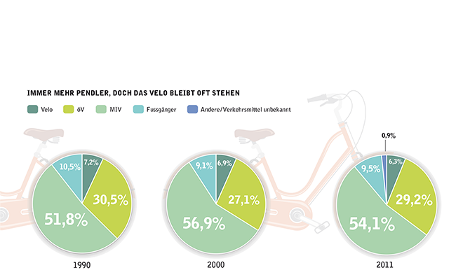 Immer mehr Schweizerinnen und Schweizer pendeln – in den Städten oft per Velo. Sonst wählen sie auf längeren Strecken zunehmend den öffentlichen Verkehr.