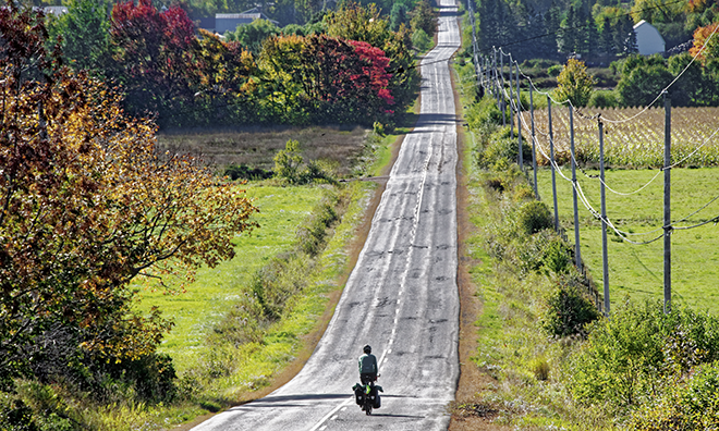 Die letzte Eiszeit hat dem Velofahrer in Nova Scotia einige anständige Buckel in den Weg gelegt. Sie sind zwar nie sehr lang, aber mancherorts ziemlich steil. Ich fahre durch Gegenden absoluter Ruhe, urwaldartige Landstriche, wo sich abgestorbene Fichten, Büsche, Gräser, Heidekraut und Moos wie in der Tundra zu einem undurchdringlichen Dickicht verfilzt haben. Wenn die Herbstsonne die graue Wolkendecke durchbricht, erstrahlen die Laubwälder in den unglaublichsten Farben.