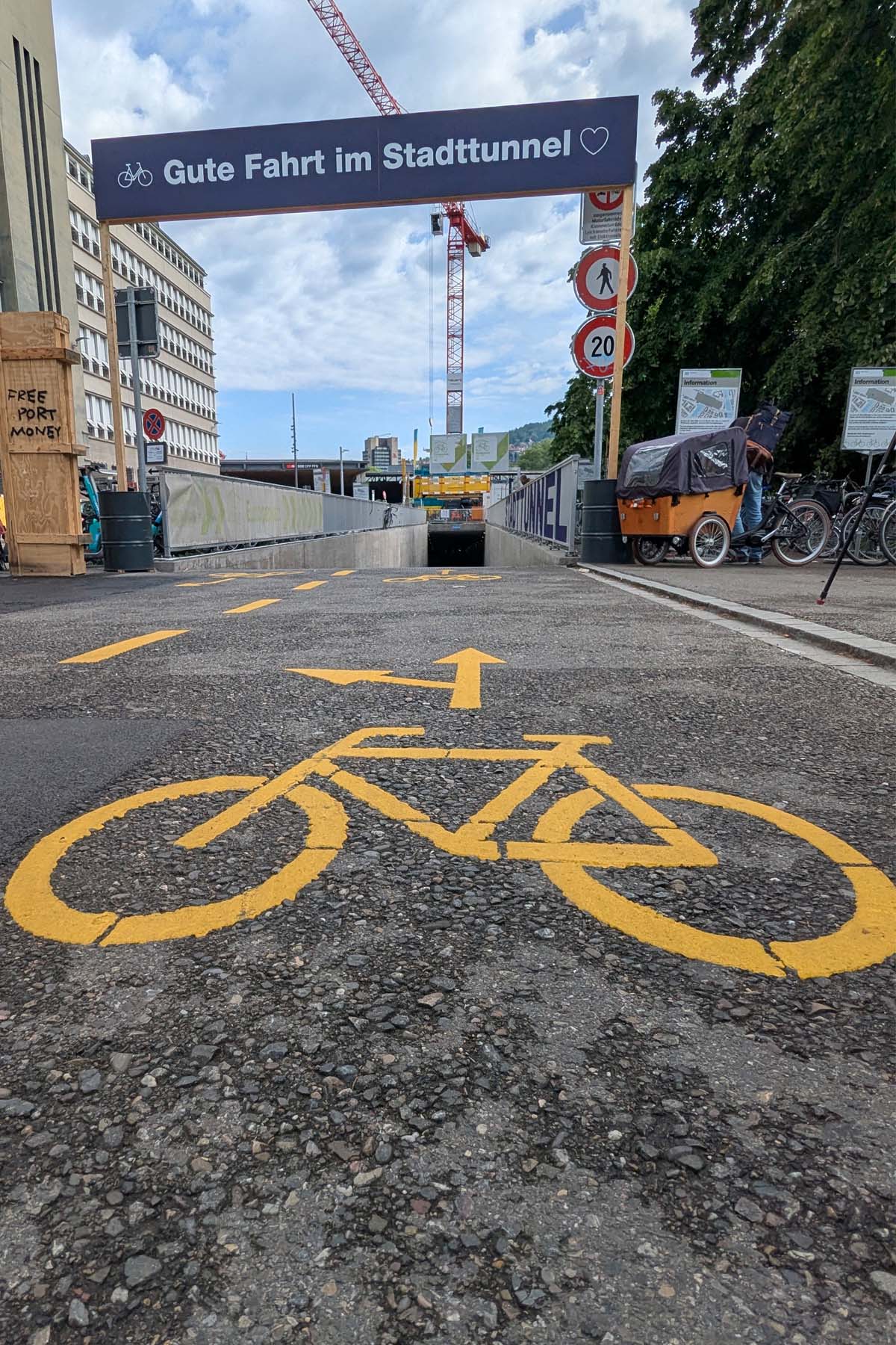 Die Verbindung unter dem Hauptbahnhof ist ein Zeitzeuge der Schweizer Verkehrsgeschichte. Ursprünglich als Teilstück einer Stadtautobahn gedacht, wird der Stadttunnel nun zu einer Schlüsselverbindung des Zürcher Veloverkehrs. Entsprechend erfreut zeigt sich Yvonne Ehrensberger, Geschäftsleiterin von Pro Velo Zürich: «Mit dem Velotunnel wurde in der Stadt Zürich zum ersten Mal ein Strassenbauprojekt realisiert, das explizit für den Veloverkehr gedacht ist – und das im Herzen der Stadt».