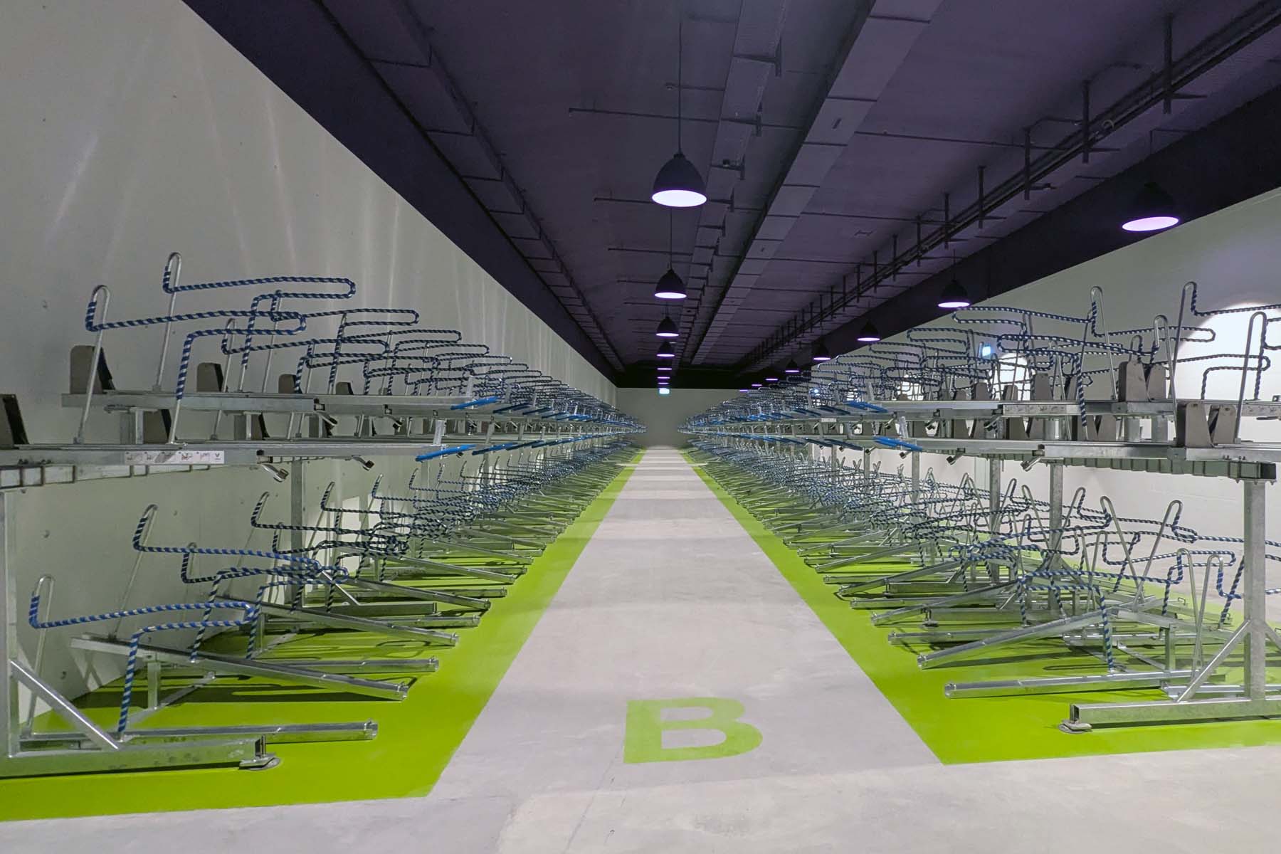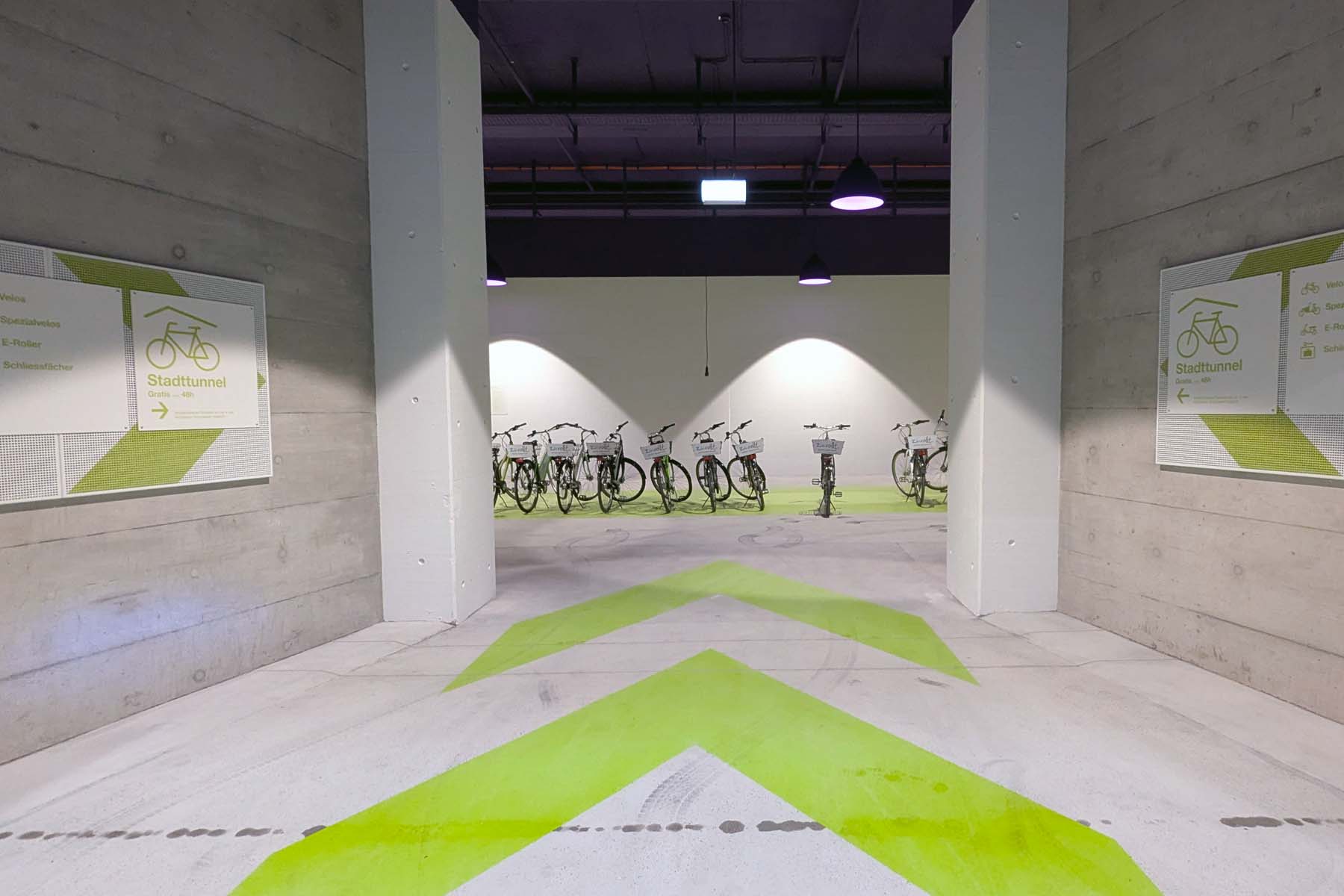 Ungefähr auf halber Strecke befindet sich das Herzstück des Tunnels: die neue Velostation. Mit direktem Zugang zum Hauptbahnhof bietet sie Platz für rund 1240 Fahrräder. Dazu gehören auch mehr als 100 extra markierte Abstellflächen für Cargobikes. Wer ein E-Bike parken will, findet sogar Steckdosen vor.