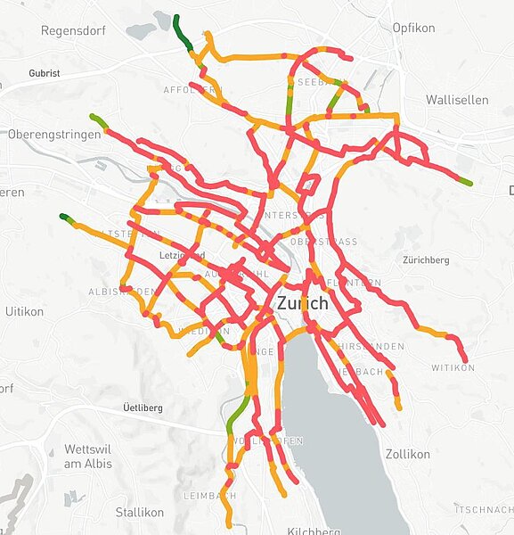 Die ersten Resultate sind ernüchternd. Von dem circa 130 Kilometer langen Velovorzugsrouten-Netz der Stadt Zürich erfüllen erst 1,3 Kilometer den Qualitätsstandard «hervorragend». Weitere 6,2 Kilometer des Netzes sind immerhin «gut». Allerdings liegen diese Abschnitte mit Ausnahme einer 170 Meter langen Strecke im Seefeld ausserhalb des hochfrequentierten Zentrums.
