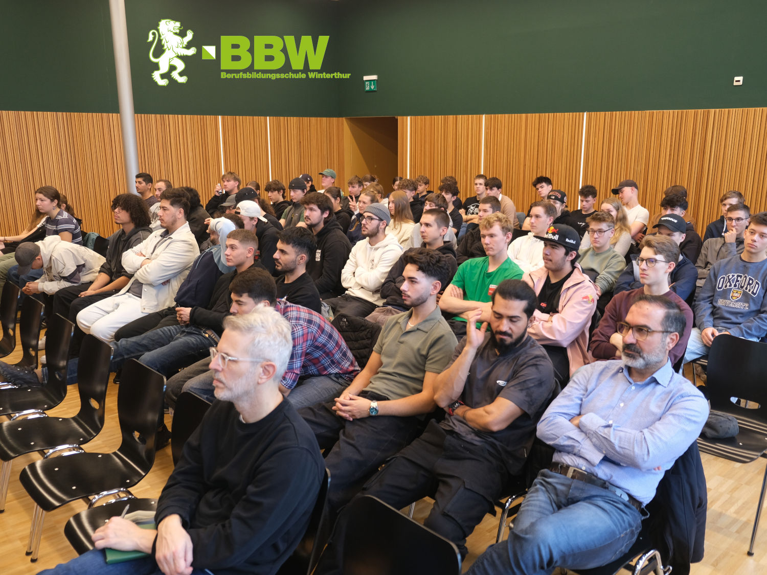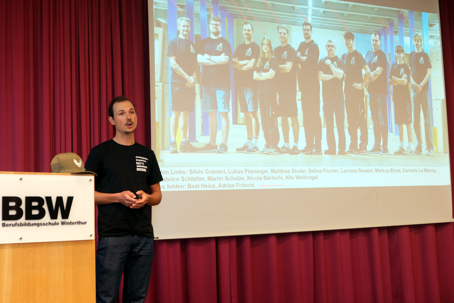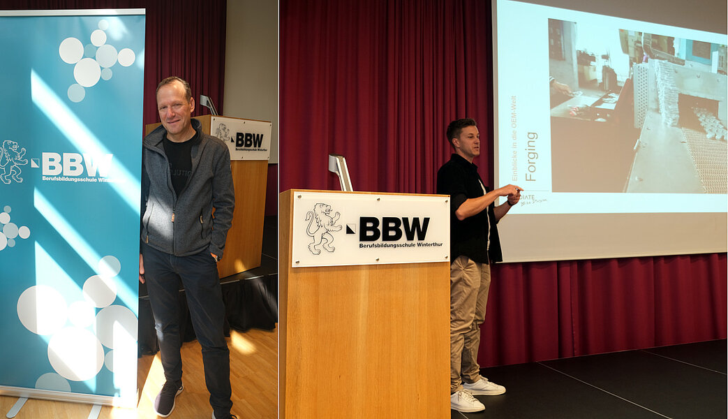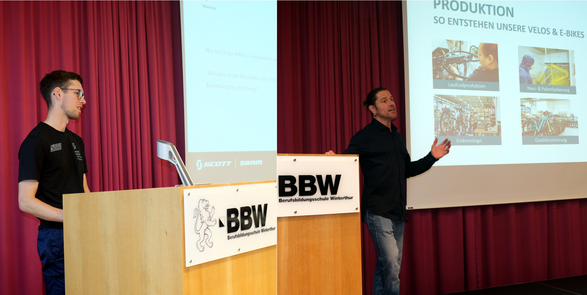 So versammelten sich am 1. Oktober 80 Lernende, der Frauenanteil lag bei 10 Prozent, in der Aula der Berufsbildungsschule Winterthur. Nach einem kurzen Grusswort von Prorektor Andreas Arnold und Abteilungsleiter Stefan Jezler vermittelte Simon Aldebert, Programm Manager beim Entwicklungsbüro Radiate Engineering & Design AG in der ersten, etwas umfangreicheren Präsentation Einblicke hinter die Kulissen der global operierenden Veloindustrie und die Entwicklung neuer Velos und E-Bikes.