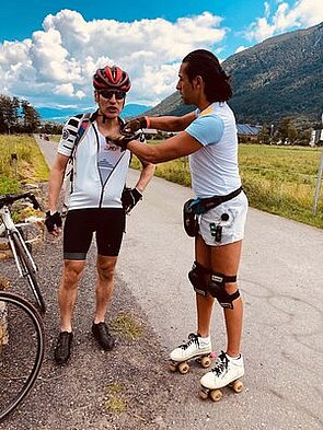 Als wir in Liechtensteins Rheinebene auf der Velopiste rollen, nähert sich uns schnell, schneller als wir, also sehr schnell, ein seltsames Phänomen, das uns zuerst vorkommt wie eine Fata Morgana. Es ist ein Mann auf Rollschuhen der Formel-1-Rennklasse, der sich nicht nur in eleganten Tanzschritten vorwärtsbewegt, sondern auch einen kräftigen Kampfhund vor sich an der Leine hält, der mit seinem Schnelllauf die Geschwindigkeit des Gespanns noch erhöht. So etwas haben wir noch nie gesehen. An der Wasserstelle kommen wir mit dem Roller ins Gespräch, der Hund stellt sich als ganz umgänglich heraus. Der Roller, samt Foulard sportlich knapp und elegant gekleidet, fragt nach unserer Reise, wir erkundigen uns nach seiner. Er sagt, so auf Rollschuhen mit seinem Hund Bobby fahre er in einem Tag locker rund um den Bodensee herum.
