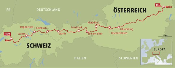 Weil die Schweiz mitten in Europa liegt, kommt man bald auf die Idee, von der Bundesstadt Bern aus die Hauptstädte der Nachbarländer anzusteuern. Im Juni 2020 zieht es Velojournal Richtung Orient. Hinter dem Rhein reihen sich 83 859 Quadratkilometer Österreich wie eine lange Wurst dahin, von West nach Ost, zwischen Vorarlberg und Wien. Die einfache Rollerroute am Inn wird nur kurze Zeit genutzt, die träge Donaufahrt ganz ausgelassen, reizvoller ist die hügelige Variante weiter südlich. Am Ende dieser würzigen bis scharfen Radlerwurst hat man begriffen, dass die Alpen bis Wien reichen.