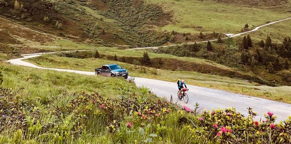 Es ist, als ob die Ortsnamen an den Pässen die Mühen von uns Radlern schon ahnten. Dort, wo die Steigung zum Hochtannbergpass am schärfsten wird, heisst das Dorf Schröcken. Als wir in der Auffahrt zum Hahntennjoch fast schlappmachen, kommen wir ins Dorf Bschlabs, wo es zum Glück ein Gasthaus gibt. Kurzum: Furkajoch, Hochtannbergpass und Hahntennjoch sind nicht sehr hoch, haben aber lange, anspruchsvolle Rampen. Dennoch werden wir im nächsten Bundesland, in Tirol, übermütig. Statt durchgehend dem Inn entlang ostwärts zu fahren, wählen wir zwei Schlenker.
